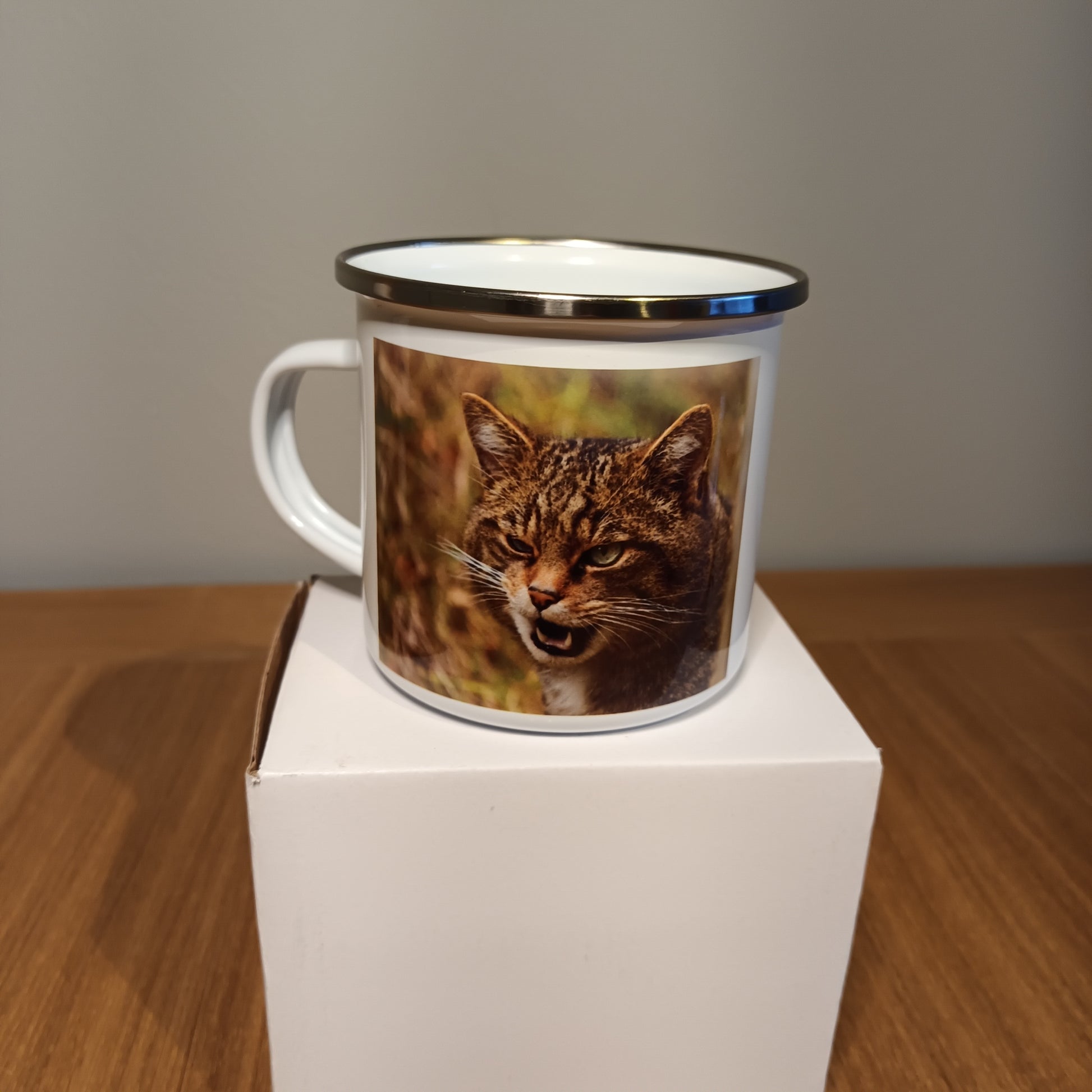 Wild Cat Enamel Camping Mug. Showcasing front and back one of my Wild Cat photographs.